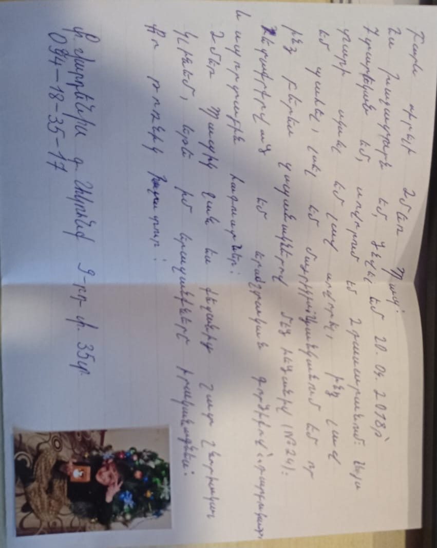 Սիրելի Ձմեռ պապ, ես Խաչատուրն եմ։ Այս տարի ինձ շատ լավ եմ պահել, լսել եմ մայրիկիս և լավ եմ սովորել։ Ուզում եմ ինձ բերես զսպանակներով մեծ հեծանիվ (N 24)։ Հետաքրքրված եմ երաժշտական գործիքներով՝ դարբուկայով։ Սիրում եմ նաև սպորտային հագուստ։